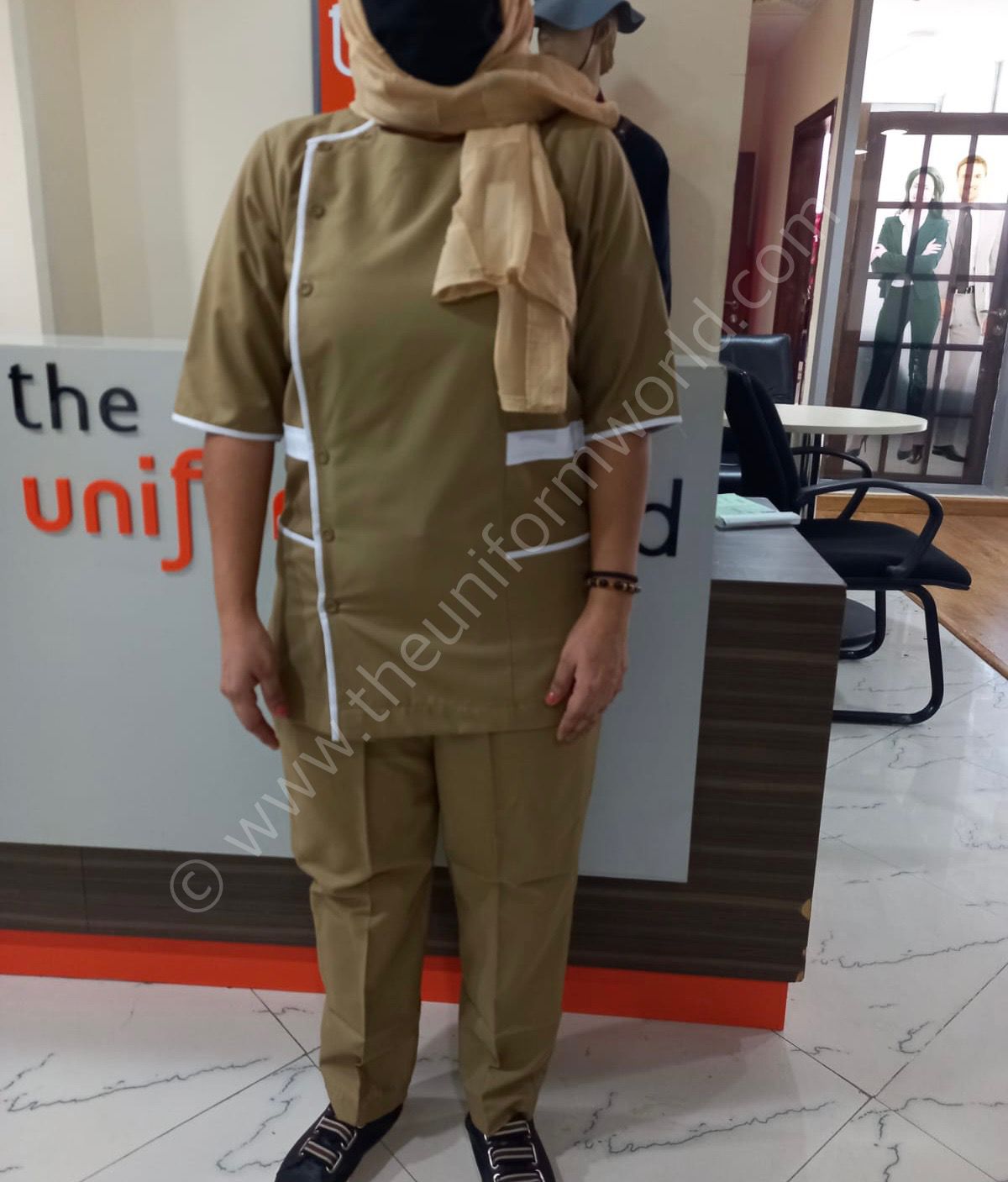 Navigate our recent Custom Piped Tunic Uniform with logo branding done for our key customers in Dubai, Abu Dhabi, Sharjah, Ajman, Umm Al Qwain, Ras Al Khaimah, Fujairah UAE and Export Markets. We can customize any types of Companies Uniforms or Workwear with our stitching, tailoring, embroidery and printing production that makes our capability in high level of satisfaction for our customer.